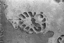 | Description: | Intact except for chips. Rolled out-turned rim, projecting on the outside. Rouletting on floor, enclosing four irregularly placed palmettes. High ring base. Glaze somewhat worn all over except for reserved bands at top of base and resting surface. Center of floor fired red from stacking. Pink clay. | |