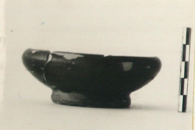 | Description: | Bowl with inturned rim. Mended from two pieces. Half of rim and side wall missing. Chipped. Broad-based ring foot, grooved underneath. Black glaze in part misfired to red. Pink-buff clay. | |