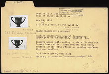 | Description: | Handles mended from several fragments. Upper part of one missing. Chipped rim. Concave upper walls ending in plain flaring rim. Convex lower walls. High moulded ring base, conical inside, with groove on resting surface. High cup handles. Dull black glaze, buff clay. | |