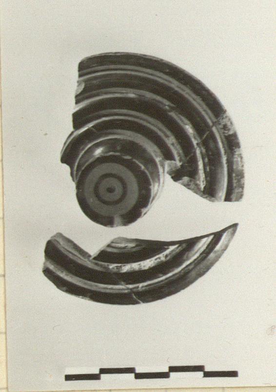 | Description: | Small molded lid. Two fragments, one with the knob. Plain rim, without flange or overhang; substantial lekanis-type knob. On the top, three concentric moulded rings, and a flat edge. The grooves between the rings are not reserved or scraped, but painted with added red. On knob, reserved disc, with circle and dot. Very good glaze; underside unglazed. | |