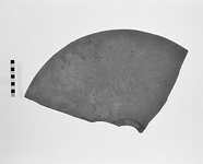 | Description: | Section of a large flat lid; at center a lifting hole surrounded by a raised collar. Pinkish clay with many large grits. Remains of lighter surfacing. | |