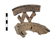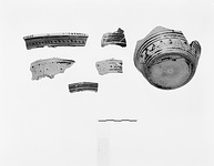 | Description: | Part of P 1646. From horizontal brace of large kalathos (or possibly splaying cut-out stand). Glazed within; cut-out faces reserved. Exterior: band of receding lozenges, dotted, the background solid-filled; diagonal struts below hatched. Smoke darkened; hard clay, gray. Dull black glaze mostly lost. ADDENDA Part of P 1646, under which it now goes. Many joining sherds from pyre H 16:6 [1967]. | |