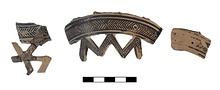 | Description: | From horizontal brace of kalathos (probably too light for a stand). Glazed within; cut-out faces reserved. On exterior, opposed groups of chevrons meeting in a reserved dotted lozenge. Hard pinkish-buff clay. Dull black glaze, somewhat metallic within, largely lost from exterior. See P 26026 (ΣΤ 857). | |