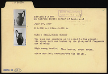 Description:   The vase was complete as it stood in the ground; its upper part was broken by the pick, small fragments now missing. Flat bottom; round mouth; high swung handle.