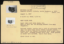 | Description: | Small deep bowl with plain rim. Much of wall and rim missing; mended from many fragments. Painted inside; center: a star of alternate buff rays and white wavy lines within scraped groove. Above, buff ivy leaves alternated with single white wavy line. Scraped groove below rim. Five grooves on lower wall outside. Small flat base. Glaze black to red. | |