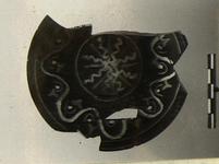 | Description: | Small deep bowl with plain rim. Much of wall and rim missing; mended from many fragments. Painted inside; center: a star of alternate buff rays and white wavy lines within scraped groove. Above, buff ivy leaves alternated with single white wavy line. Scraped groove below rim. Five grooves on lower wall outside. Small flat base. Glaze black to red. | |