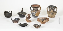| Description: | Bowl with out-turned rim. Fragments missing from rim, walls and base. High ring base; steep walls; plain flaring rim. Double rouletting on floor. Glaze dull and worn brown to black. Traces of stacking. Half a dozen more in tin. | |