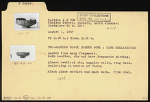Description:   Mended from many fragments. Both handles, rim and base fragments missing. Almost vertical rim, angular walls, ring base. Rouletting at center of floor.