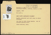 | Description: | Handle, and wall area to which attached, preserved. Ivy leaf on wide strap handle. End of incised pattern, left. Glaze mottled, worn. | |