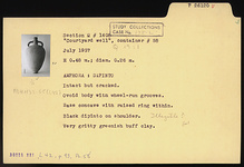 | Description: | Intact but cracked. Ovoid body with wheel-run grooves; base concave with raised ring within. Black dipinto on shoulder. Very gritty greenish-buff clay. | |