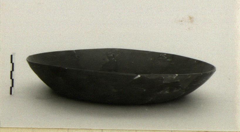 Much mended and in part filled out with plaster. Flat-floored plate with flaring wall and plain rim.