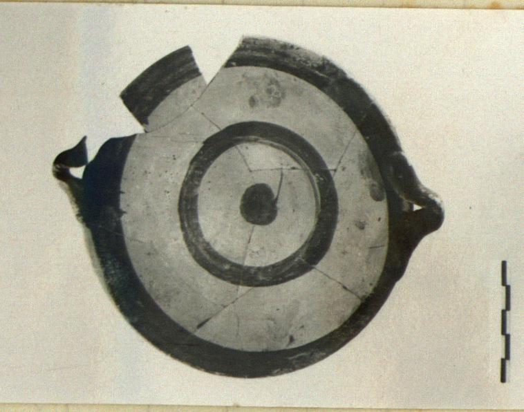 | Description: | Mended from many pieces; two small fragments of rim and a little of one handle missing. Small flat base; flaring walls; two thick loop handles attached to edge of plain rim. Buff clay. Unglazed except for handles and for bands on floor, one at outer edge and one at mid-point; dot also at center of floor. Glaze poor and thin. | |