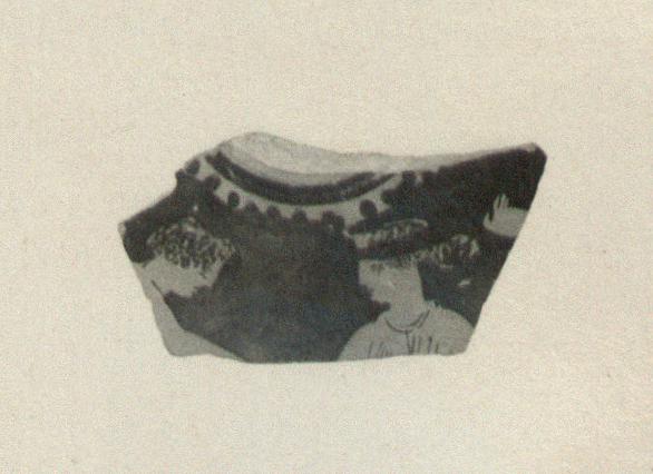 | Description: | Top of fragment preserves segment of border of central handle: slightly moulded band and row of careless dots in reserved area. Below this, at left, male head with part of shoulders and raised right arm, facing right. At right, female of whom head and draped shoulders are preserved. Hair in knot at back, wide fillet above. In field at edge of fragment, right, part of some object (hand?). Hair rendered in dilute glaze; relief lines sparsely used; fairly careful work. Attic clay. Reasonably good glaze. ADDENDA (Sept. 2020), according to Agora XXX, Pyxis Lid fragment. | |