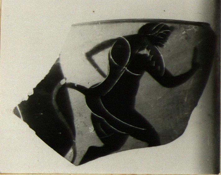 | Description: | Fragment from kylix rim. Satyr moving right with uplifted right hand. Behind him, part of a large eye. Added red on beard and tail. Reserved line just inside rim. | |