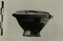 | Description: | Mended from many fragments; lid, rim and part of wall missing. Small half-conical bowl on high foot; flange for lid. Foot flat beneath. Light gray clay, burned. Poor black glaze. For other pyre-type pot fragments, left in storage, cf. Nb. p. 1137. | |