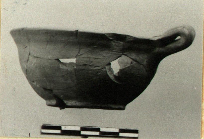 | Description: | Fragments missing from body and rim; no lid. Mended from many pieces. Low false ring base, left rough beneath; deep body; lip offset to take lid; single loop handle. Pink-buff clay. | |