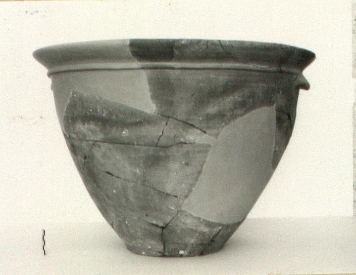 | Description: | Numerous fragments preserve base, much of walls and part of rim; completed in plaster. Large lekane on flat bottom; flaring walls; flaring rim above a ridged line; lug handles. Buff clay. | |