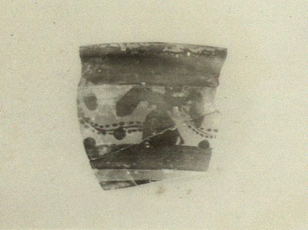 | Description: | Mended from two pieces. Lip slightly offset. Figured zone depicts winged(?) figure, left. Vine pattern in field. Reserved band below handle zone and on inside of rim. No incisiion. Poor glaze, in part fired red. | |