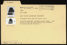 | Description: | Fragment from rim and upper wall. Incised pattern: dolphin above waves. The waves filled in with white; dot rosette in white beside dolphin. | |