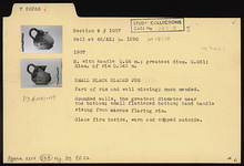 | Description: | Part of rim and wall missing; much mended. Small flattened bottom; rounded walls, the greatest diameter near the bottom; band handle rising from narrow flaring rim. Glaze firm inside, worn and chipped outside. | |