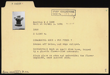 | Description: | Floral knob. Broken off below; edge chipped. Cylindrical knob on small disk base, topped by a plastic flower-like ornament. Black glaze on stem and underside; the flower unglazed, once painted pink. | |