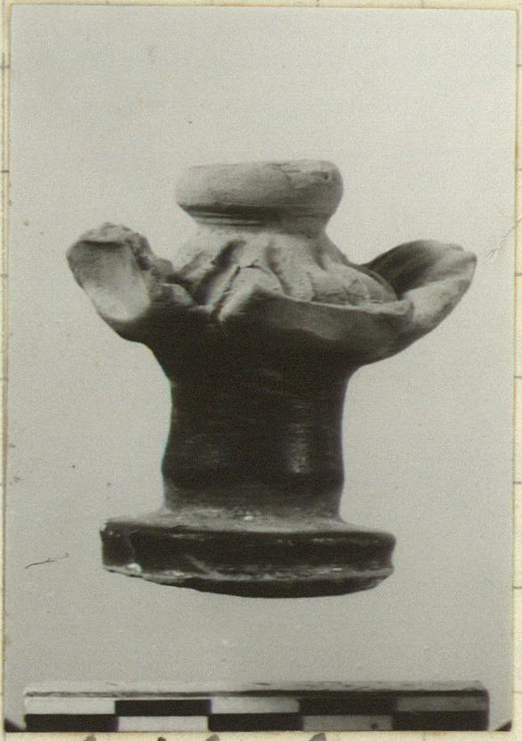 | Description: | Floral knob. Broken off below; edge chipped. Cylindrical knob on small disk base, topped by a plastic flower-like ornament. Black glaze on stem and underside; the flower unglazed, once painted pink. | |