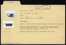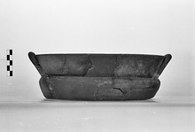 | Description: | Parts of walls and bottom missing; restored in plaster. Flat bottom; bulging walls; steeply rising rim, offset inside for lid; handles pressed against wall and rising slightly above rim. Reddish micaceous ware, blackened from use. | |