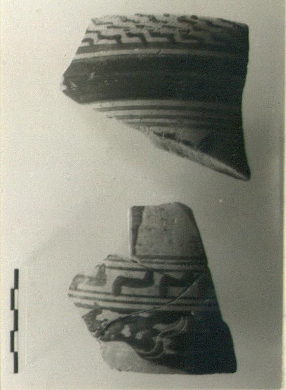 | Description: | a) Flaring neck thickend outside, with step-maeander. Glaze, then bands. On neck, tops of maeander, incised. Red glaze. b) Three joining fragments. Step-maeander between bands. | |