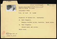 | Description: | a) Wall fragment depicting hanging stuffed spiral, tendrils. Bands below. b) Wall fragment depicting glazed bands and circle. Glaze worn. | |