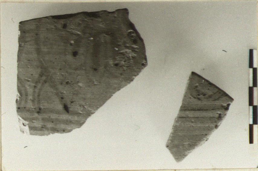 | Description: | a) Wall fragment depicting hanging stuffed spiral, tendrils. Bands below. b) Wall fragment depicting glazed bands and circle. Glaze worn. | |