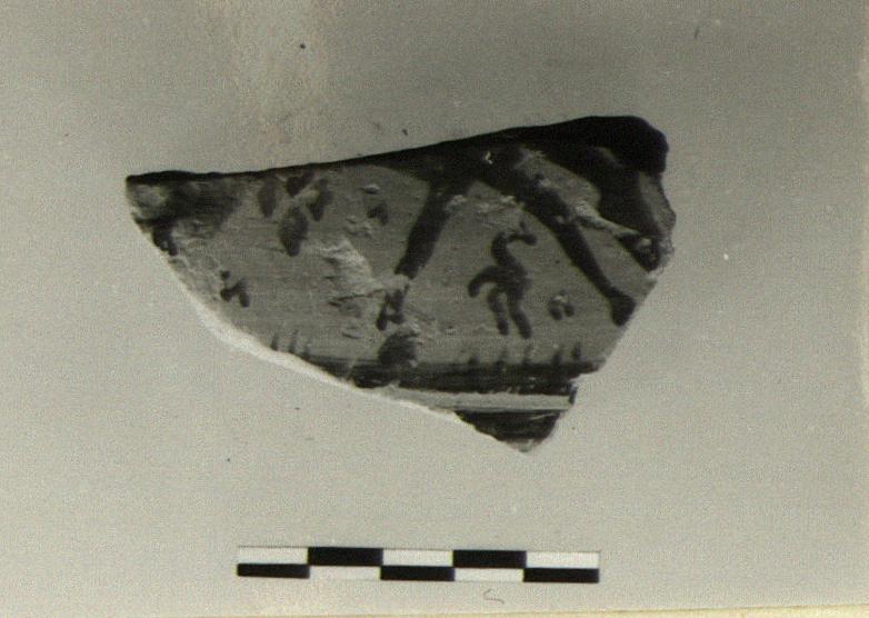 Description:   Fragment of closed pot, broken all around. Grazing horse to right. Bird between forelegs. "N" ornament, diamonds in field. Bands below.