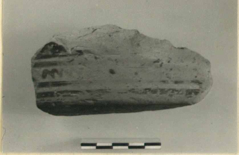 | Description: | Part of flat surface with flaring sides. Painted top; borders, zigzags, solid glaze on sides. Underside glazed. Brownish glaze. | |