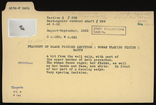 | Description: | A bit from the wall with part of the upper border of dots preserved. Depicts woman playing flutes, facing right. In front of her, part of a dancing satyr. Flutes and woman's hands and face are white. Very sparing incision. | |