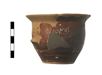 | Description: | Many joining fragments; restored in plaster, except for handle. Wide flaring lip, slightly rounded walls, flat base. Brown to black glaze, flaked and chipped outside. Inside, red glaze over all, except for bands at lip. Base and small ring just on wall above reserved. Graffito on outside wall: <graphic> Pink clay. | |