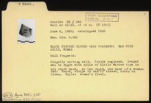| Description: | Wall fragment from closed vase. Slightly curving wall. Inside unglazed. Draped man to right with kylix of little master type in his right hand. At the right, the hand of a woman. Red for beard, stripe on hem of sleeve, cross on cloak. White for woman's flesh. | |