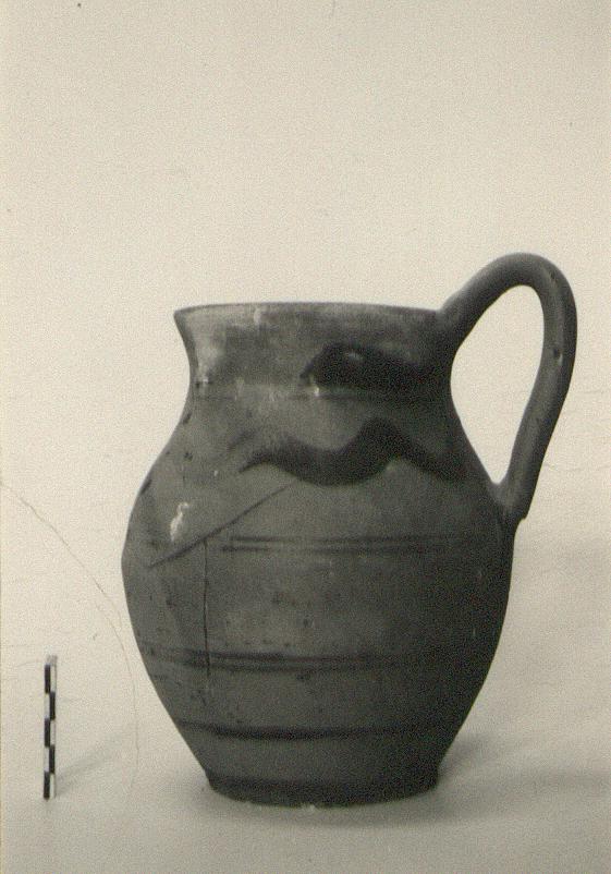 Description:   Mended from many fragments. Restored in plaster. Wide, round mouth, full body, broad ribbon handle; slight indication of disk foot. Band of broad line around neck. Broad wavy line on shoulder and handle. Three sets of fine dark lines on body.