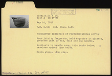 | Description: | Imitation of Protocorinthian. Four joining fragments, held together in plaster, preserve part of rim, wall and one handle. Verticals in handle zone, thin bands below. A careless spiral line below. Brown glaze, pink clay. | |