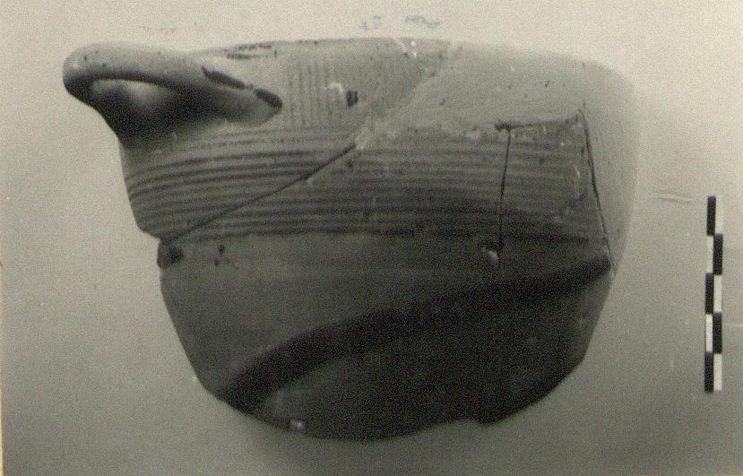 | Description: | Imitation of Protocorinthian. Four joining fragments, held together in plaster, preserve part of rim, wall and one handle. Verticals in handle zone, thin bands below. A careless spiral line below. Brown glaze, pink clay. | |