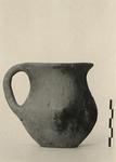 | Description: | Intact except for small rim fragment restored in plaster. Flaring rim, rolled handle, flat base. Burnt in front. Coarse brown clay. | |