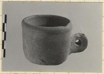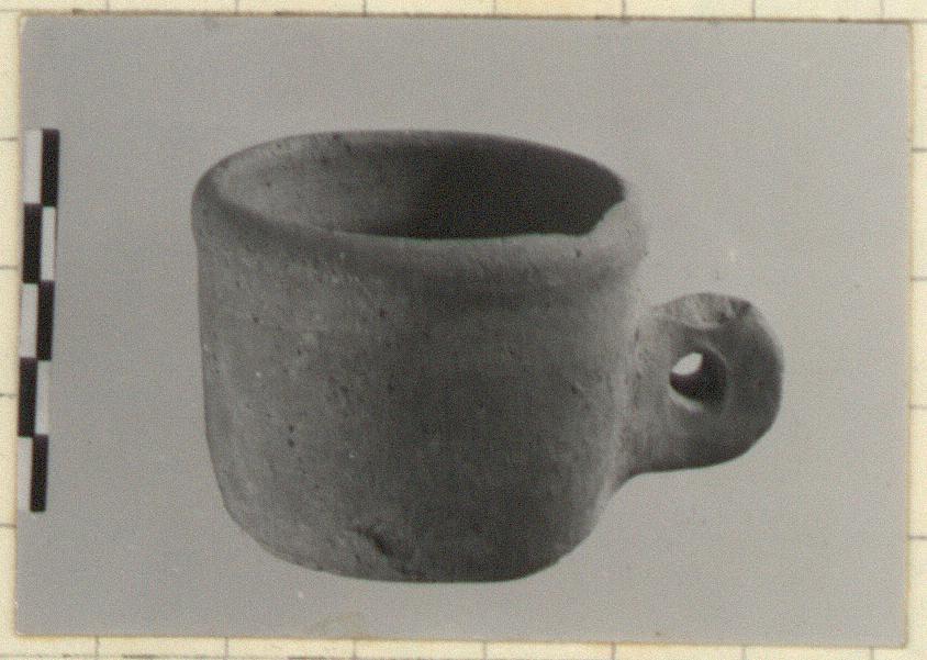 | Description: | Complete but chipped. Flat bottom, vertical walls, with slight inset area just before plain lip. Handle, pierced horizontally, set at lower wall. Orange clay. | |