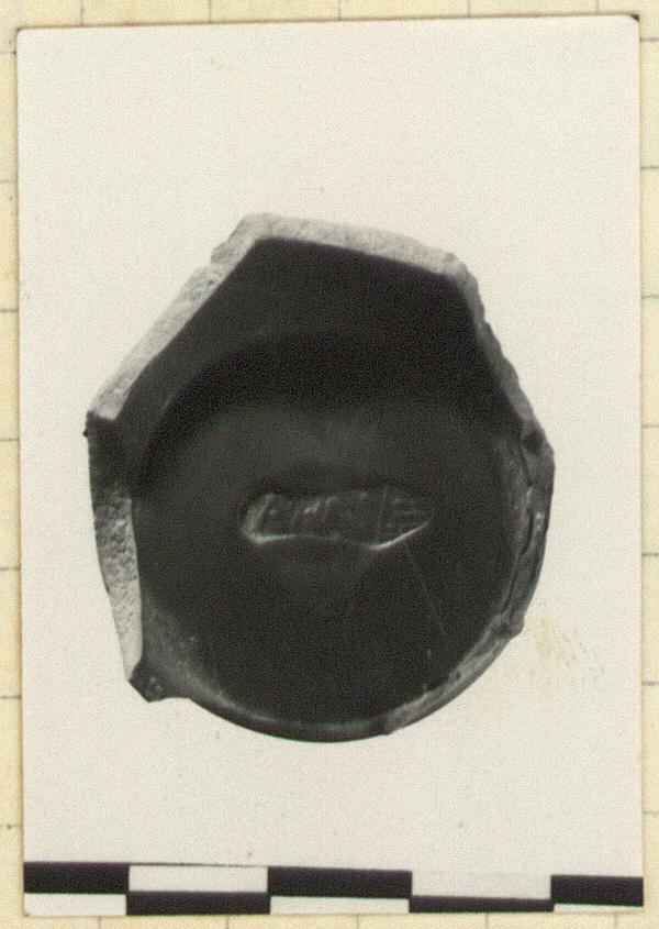 | Description: | Base and small part of lower wall preserved. Ring foot; flaring wall. Stamp on floor. Sigillata. Red glaze inside and out; firm. | |