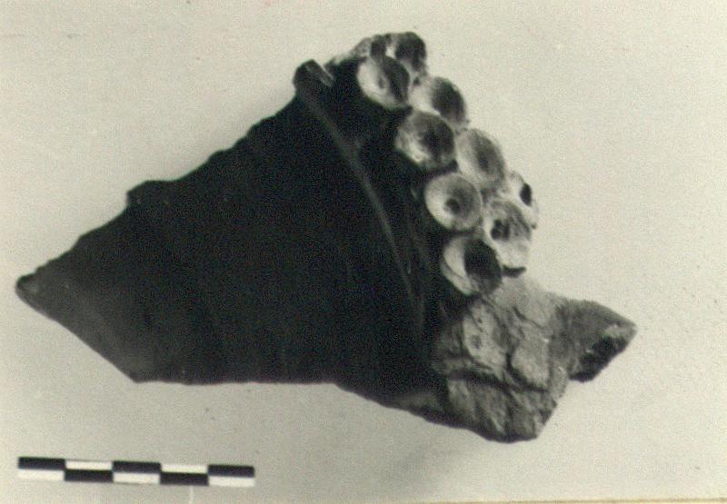 | Description: | Part of wall, rim and handle preserved. Small, crudely made cups in three rows on rim. Coarse red clay. | |