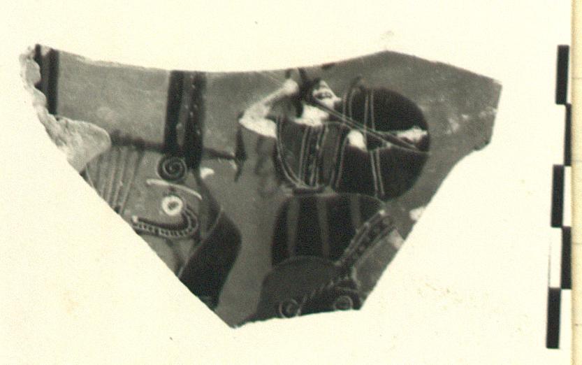 Description:   Fragment from upper part of figured panel. Athena right, springs from head of Zeus. Behind her, large cithara. Red for hair of Zeus, stripes on Athena's dress and on frame of cithara. White for Athena's flesh, dots on the hem of her dress, details of cithara, some object to right of Athena.