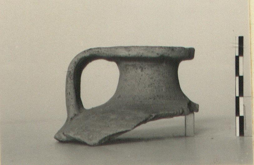 | Description: | Single fragment preserves mouth, handle, neck and part of wall. Flat, round rim, band handle attached at rim. Black glaze almost entirely worn. Light clay. | |