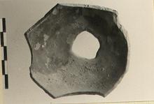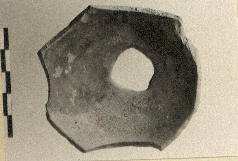 | Description: | From base of pot with disk foot. Hole cut in foot before firing. Careless glazing over part of inside and part of outside and underside. Reddish glaze; highly micaceous clay. Similar to P 26571. | |