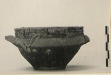 | Description: | Handles broken off. Small fragments missing from rim; wall chiped. Many joining fragments. Reserved handle zone and resting surface. Misfired glaze, chipped. Pink-buff clay. Subgeometric. | |