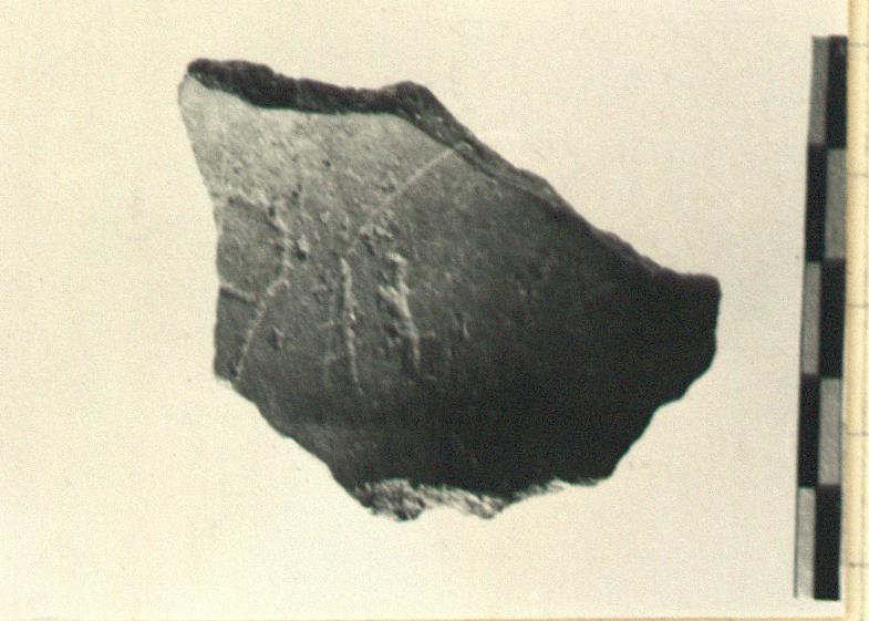 | Description: | From neck of unglazed water jug. Incised on outside: <graphic> Coarse micaceous brown clay, gray at core. | |