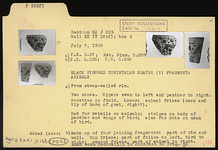 | Description: | a) From steep-walled rim. Two zones. Upper: swan to left and panther to right. Rosettes in field. Lower: animal frieze (neck and tip of horn of goat, right?). Red for details on animals; stripes on body of panther and wings of bird; also for dots on neck of bird. b) Made up of four joining pieces: part of rim and wall. Top frieze: part of feline to left, bird to right; second frieze, part of animal to right. Much worn decoration in contrast to fragment a). | |