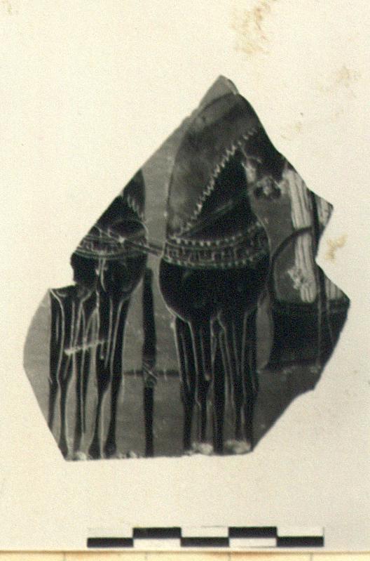 | Description: | Two joining fragments from wall of large closed pot. Quadriga in frontal view. Preserved: part of chariot car with charioteer standing in it; parts of two left-hand horses including the head of one. Red for horses' manes, body of car. White for chiton of charioteer. | |
