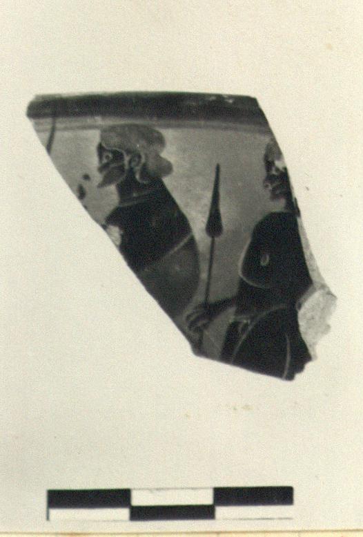 | Description: | a) From rim of skyphos. Man, probably seated, to left, holding staff. Red for hair, beard and stripe on cloak. Behind him stands nude youth holding spear. b) Wall fragment. Upper body of mantled figure holding spear. Red on mantle. | |
